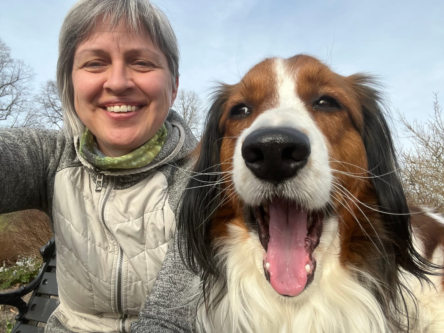 Omaan hyvinvointiini vaikuttavat suuresti mahdollisuus ulkoiluun erityisesti koirieni kanssa. Kuvassa kanssani on vanhempi koirani Eppu. Olemme juuri starttaamassa Tuorlan luontopolulle.